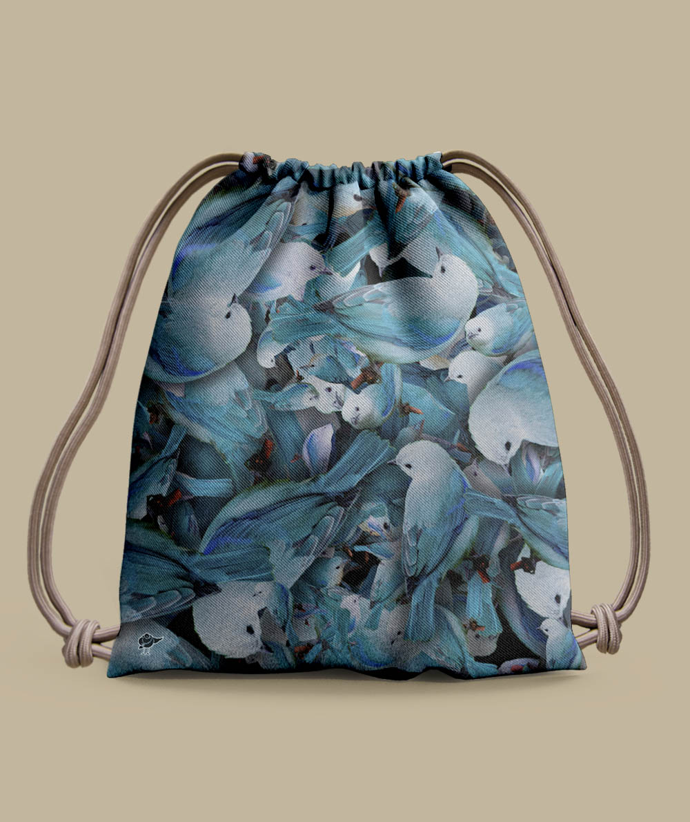 Tula en lona frontal impermeable resistente a la tensión y al rasgado, liviana y maleable para usar en tu actividad favorita con estampado aleatorio en diversos ángulos y tamaños. Rapor 5000*500px a 300 dpi escalable. El Azulejo es un ave urbana muy social, llamativa por sus variados azules, adaptado fácilmente al entorno.